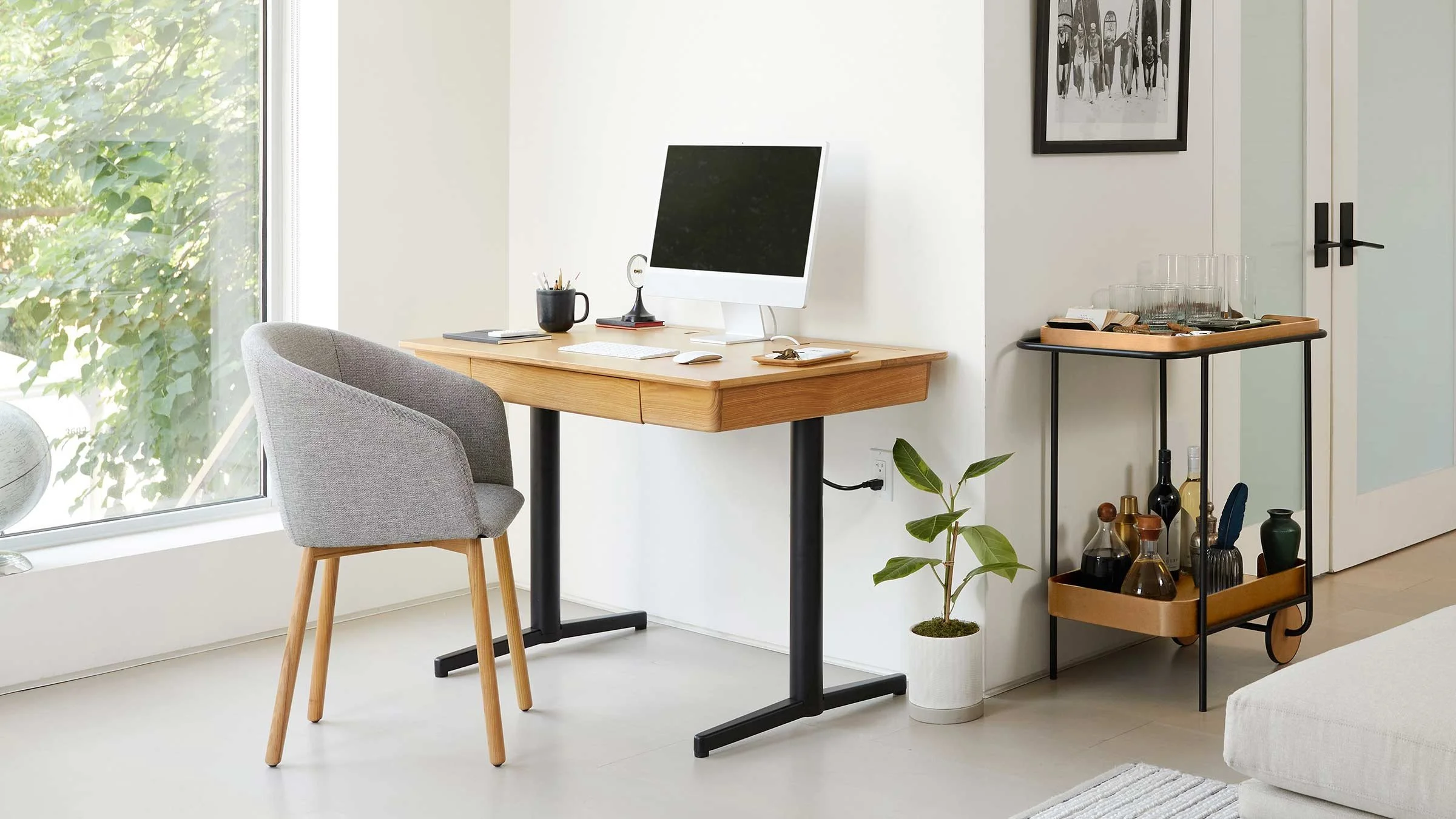 The Pilot Desk was designed to balance a residential aesthetic with professional-grade functionality. It has the option of stationary hardwood legs or dual-stage height-adjustable legs that can shift from seated work to standing up, perfect for resisting the post-lunch slump. The desk has twin table-top hatches to hide cables & accommodate power strips, along with a pencil drawer wide enough to store a key board and mouse.
